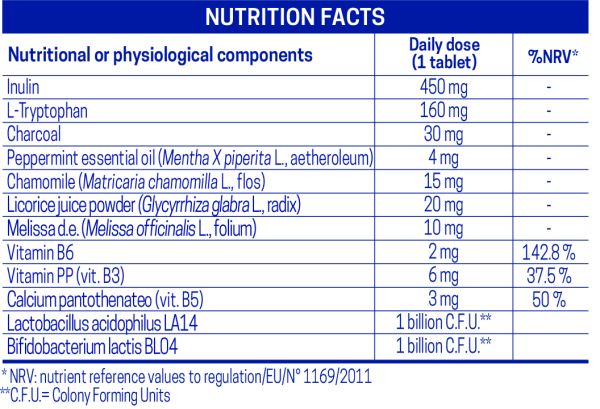 Food supplement based on L-Tryptophan, charcoal and probiotics, with mint, chamomile, melissa and licorice.