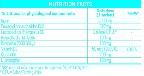 PROLACTIS® GG PLUS is a symbiotic combination of Inulin, FOS and Lactobacillus Rhamnosus GG for the balance of intestinal flora, with Boswellia, Bromelain, Vitamin D3, Quercetin and L-tryptophan.