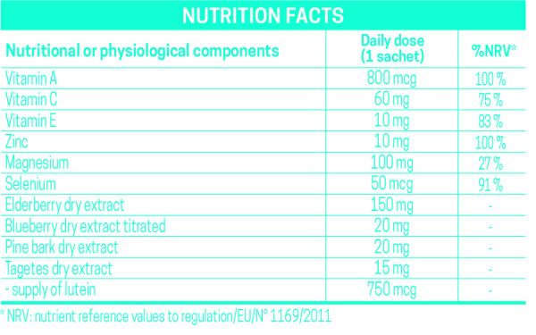 Food supplements should not be used as a substitute for a varied and balanced diet and a healthy lifestyle. Do not exceed the recommended unit. Keep out of reach of children under three years of age. Store in a cool, dry place away from light and localised heat sources, sunlight and avoid contact with water. The end of validity date refers to the product correctly stored in unopened packaging. Sachets cannot be sold individually.