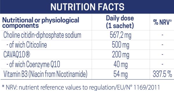 Maltodextrin; Choline citidin-diphosphate sodium salt (Citicoline CDP choline); CAVAQ10® (Coenzyme Q10, gamma-cyclodextrin); Flavour; Acidifiers: Citric acid, Tartaric acid; Vitamin B3 (Niacin from Nicotinamide); Anti-caking agents: Silicon dioxide; Sugar substitute: sucralose. a bioavailable coenzyme Q10. CAVAQ10® is a trademark of WACKER ChemieAG