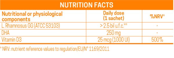 RINFODIM 3® is an innovative formulation based on Lactobacillus Rhamnosus GG (ATCC 53103), DHA and vitamin D3 specifically for the function of the immune system.
