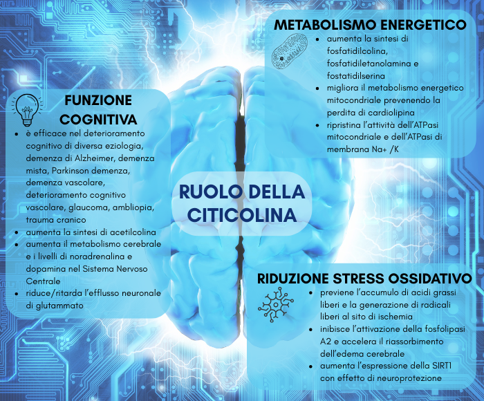 Pertanto, grazie alle sue caratteristiche peculiari, la Citicolina è l’unico precursore esogeno di colina ad apportare anche la componente citidinica fornendo, dunque, una fonte esogena di colina e citidina, necessarie per sintesi dei fosfolipidi, metabolismo cellulare, sintesi di neurotrasmettitori e neuroprotezione.