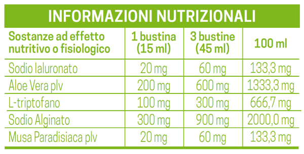 Integratore alimentare a base di acido ialuronico, sodio alginato, L-Triptofano, Aloe Vera e Musa Paradisiaca.