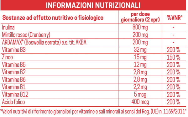 Inulina; Mirtillo rosso – Cranberry (Vaccinium macrocarpon Aiton, fructus) succo concentrato polvere al 90% (supportato su Magnesio Idrossido e Calcio Fosfato); Boswellia e.s. (Boswellia serrata Roxb., gummi-resina) tit. 75% Acidi Boswellici; Agenti antiagglomeranti: acidi grassi, sali di Magnesio degli acidi grassi, biossido di Silicio, Talco; Agente di carica: Cellulosa microcristallina (gel di Cellulosa); Maltodestrina; Vitamina B3 (Niacina); Zinco ossido; Vitamina B5 (Calcio Pantotenato); Vitamina B12 (Cianocobalamina); Agenti di rivestimento: Etilcellulosa, Idrossi-propil-cellulosa, Polivinilpirrolidone, Cera di Carnauba; Vitamina B6 (Piridossina idrocloruro); Vitamina B1 (Tiamina idrocloruro); Vitamina B2 (Riboflavina); Acido Folico (Acido Pteroil-Monoglutammico).