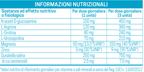 Integratore alimentare con amminoacidi, N-acetil-D-Glucosamina, carotenoidi da Dunaliella salina, Potassio, Magnesio e Zinco.