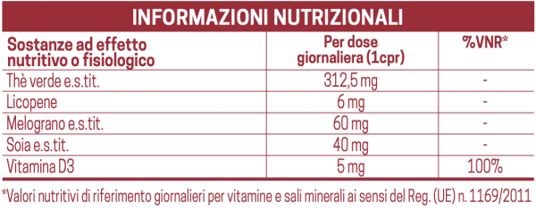 Integratore alimentare a base di Catechine (da thè verde), Licopene, Melograno, Isoflavoni di soia e Vitamina D3.