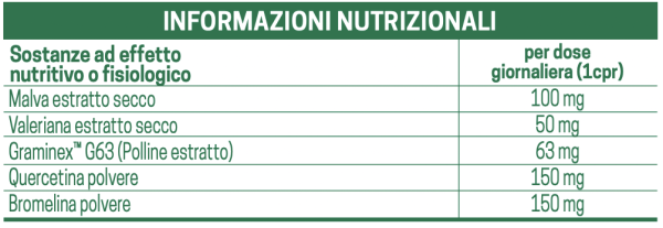 Quercetina da Sophora japonica L. (flos); Bromelina da Ananas Comosus (L.) Merr., (stipites) e.s. (2400 GDU/g); Agenti antiagglomeranti: Acidi grassi, Carbossimetilcellulosa sodica reticolata, Sali di magnesio degli acidi grassi, Biossido di Silicio, Talco; Agenti di carica: Cellulosa Microcristallina (gel di cellulosa), Fosfati di Calcio; Malva (Malva sylvestris L., folium) estratto secco titolato; Maltodestrina; Graminex™ G63® estratto di polline di Segale (Secale cereale L., flos); Valeriana (Valeriana officinalis L., radix) estratto secco titolato; Agenti di rivestimento: Etilcellulosa, Polivinilpirrolidone, Idrossi-propil-cellulosa, Cera di Carnauba.